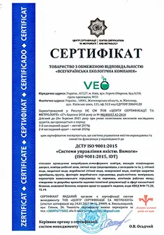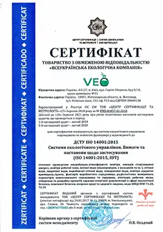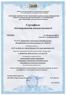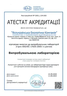 Our laboratory, LLC “All-Ukrainian Environmental Company,” holds a Certificate of Competence Confirmation issued by